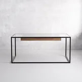 طاولة حديثة مستطيلة بمقاس 160 × 80 سم وارتفاع 60 سم. تأتي بسطح من الزجاج الشفاف المقوّى وهيكل من المعدن يمنحها مظهرًا عصريًا وثباتًا عاليًا. أسفل سطح الزجاج يوجد رف أو وحدة ترتيب مصنوعة من MDF تضيف وظيفة عملية ولمسة جمالية للتصميم. تجمع الطاولة بين الزجاج والمعدن ومواد  لتقديم قطعة أنيقة مناسبة لغرف الجلوس أو المكاتب أو مساحات العرض.